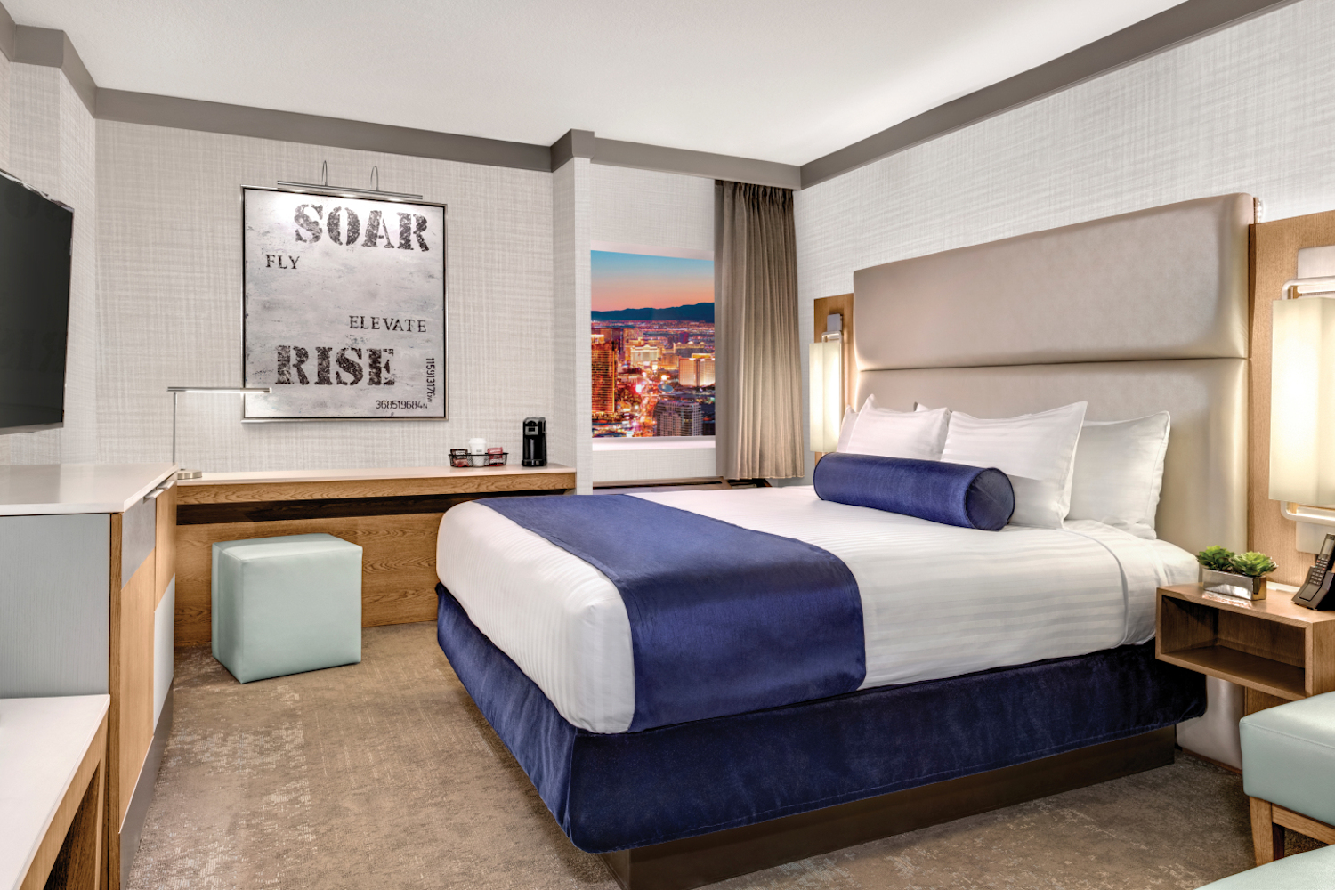 The Elevate King is 340 square feet and includes one king bed. Rooms feature a mini fridge, 55-inch HD TV, in-room safe and USB charging stations. For those who need to work while they play, the room includes a designated work area with desk. Fresh and modern, our Elevate King will take your stay to a new level.