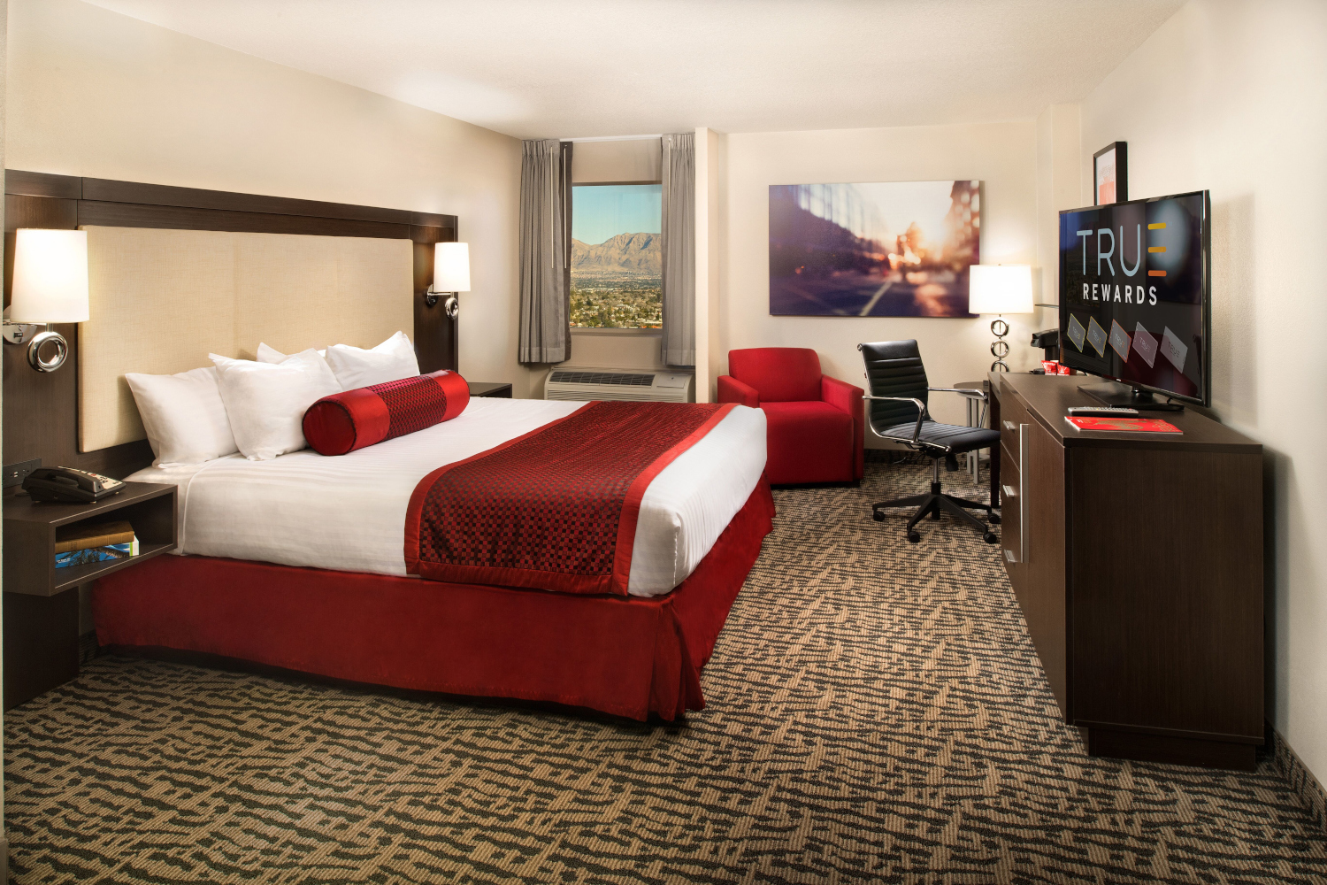The Elite King is 340 square feet and includes one king bed. Rooms feature a mini fridge, 55-inch TV and in-room safe. For those who need to work while they play, the room includes a designated work area with desk. The perfect room to catch what little sleep awaits.